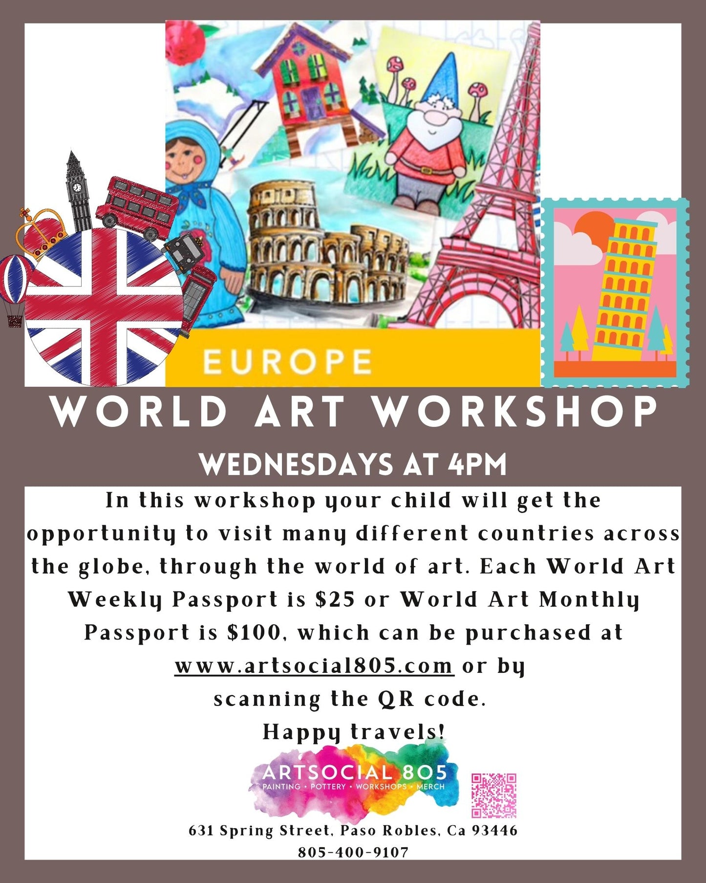 In this workshop your child will get the opportunity to visit many different countries across the globe, through the world of art. World Art weekly passports are $25 and World Art monthly passports are $100 which can be purchased at www.artsocial805.com or by scanning the QR code. Happy travels!